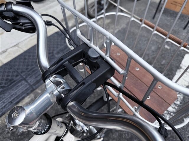 BROOKSバスケットはワンタッチで取り外しができるスグレモノで、今もカタログ製品として売られているご長寿バスケット。バスケットを取り付けるためのアタッチメントは現在のハンドルに装着済み。
